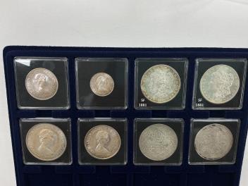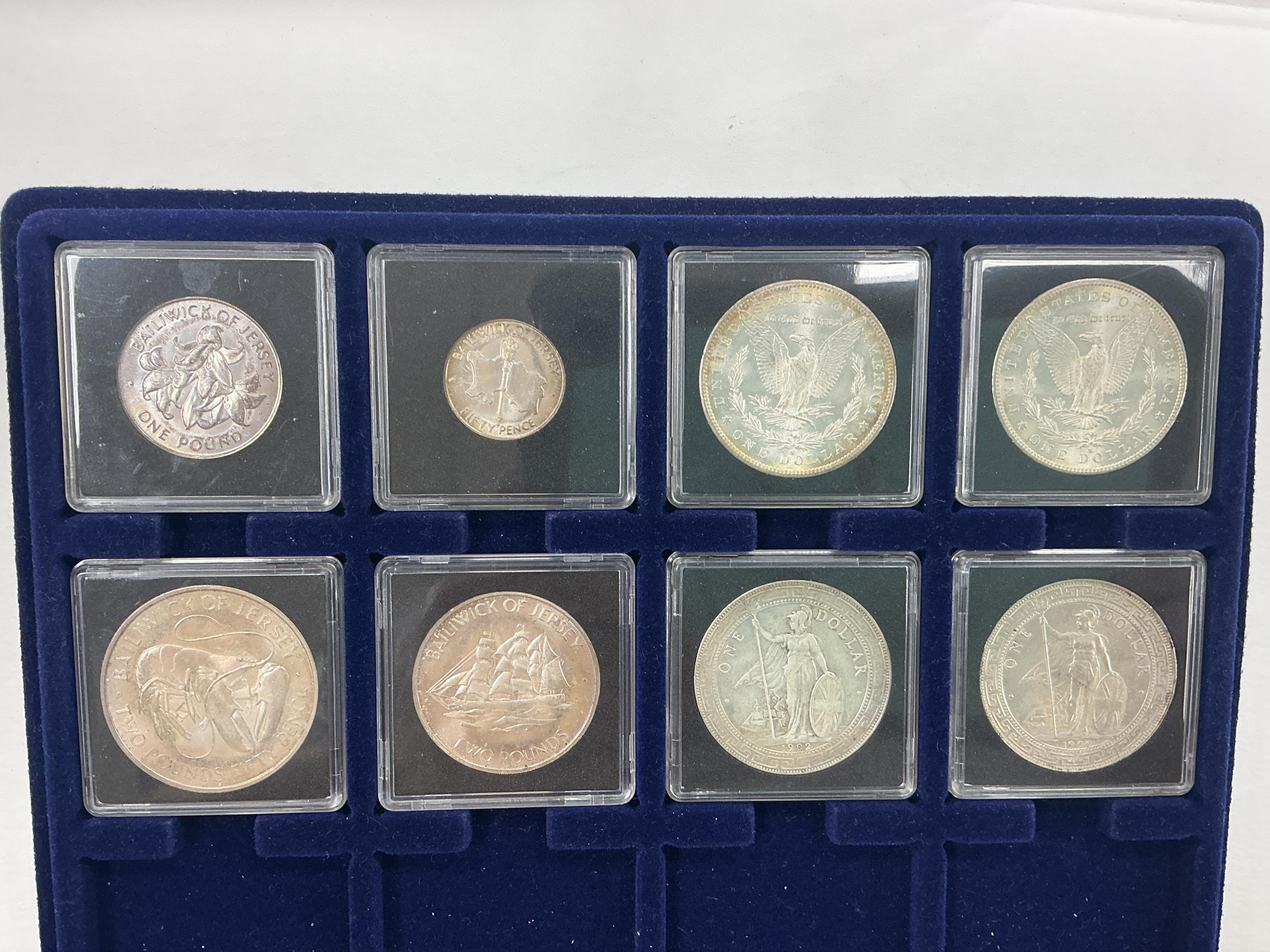 Lot 2045 , Two American silver Morgan dollars, 1881S, good VF, two British silver Trade Dollars, 1900B, VF and 1902, VF, and Bailiwick of Jersey silver fifty pence, one pound, two pounds, and two pounds fifty pence coins, light ton