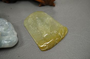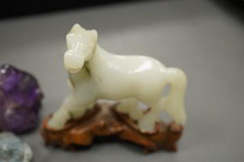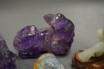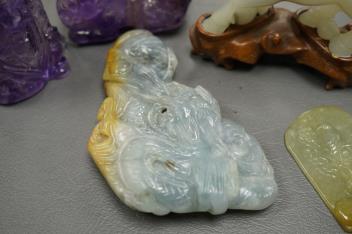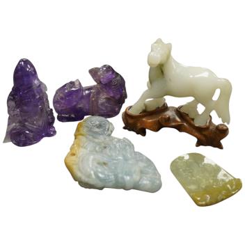 Lot 474 , Two Chinese amethyst quartz carvings of a lion dog and eagle and Shou Lao and three Chinese jadeite carvings - largest 9.5cm wide5)