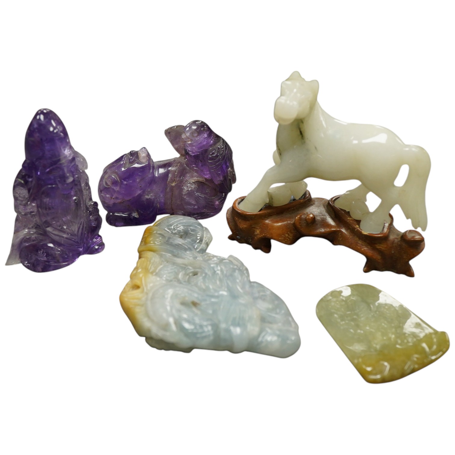 Two Chinese amethyst quartz carvings of a lion dog and eagle and Shou Lao and three Chinese jadeite carvings - largest 9.5cm wide5)