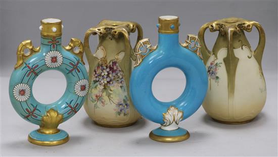 Two Christopher Dresser style ceramic cloisonne vases and a pair of Turntepliz Austrian vases
