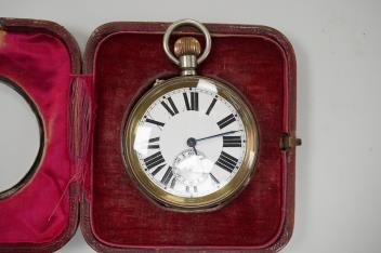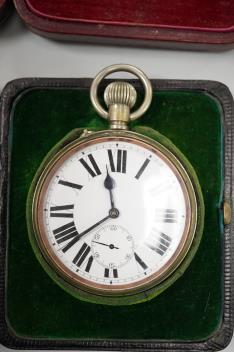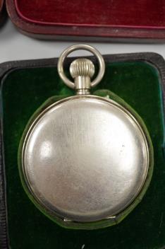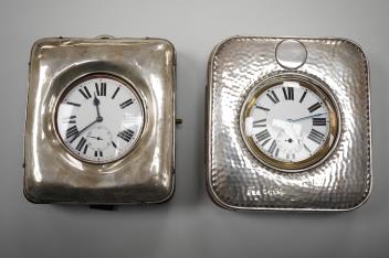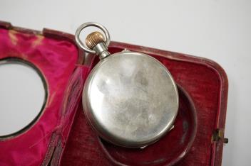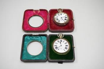 Lot 837 , Two Edwardian silver mounted leather travelling watch cases, Chester 1905 and Birmingham, 1907, both containing a chrome cased keyless pocket watch.