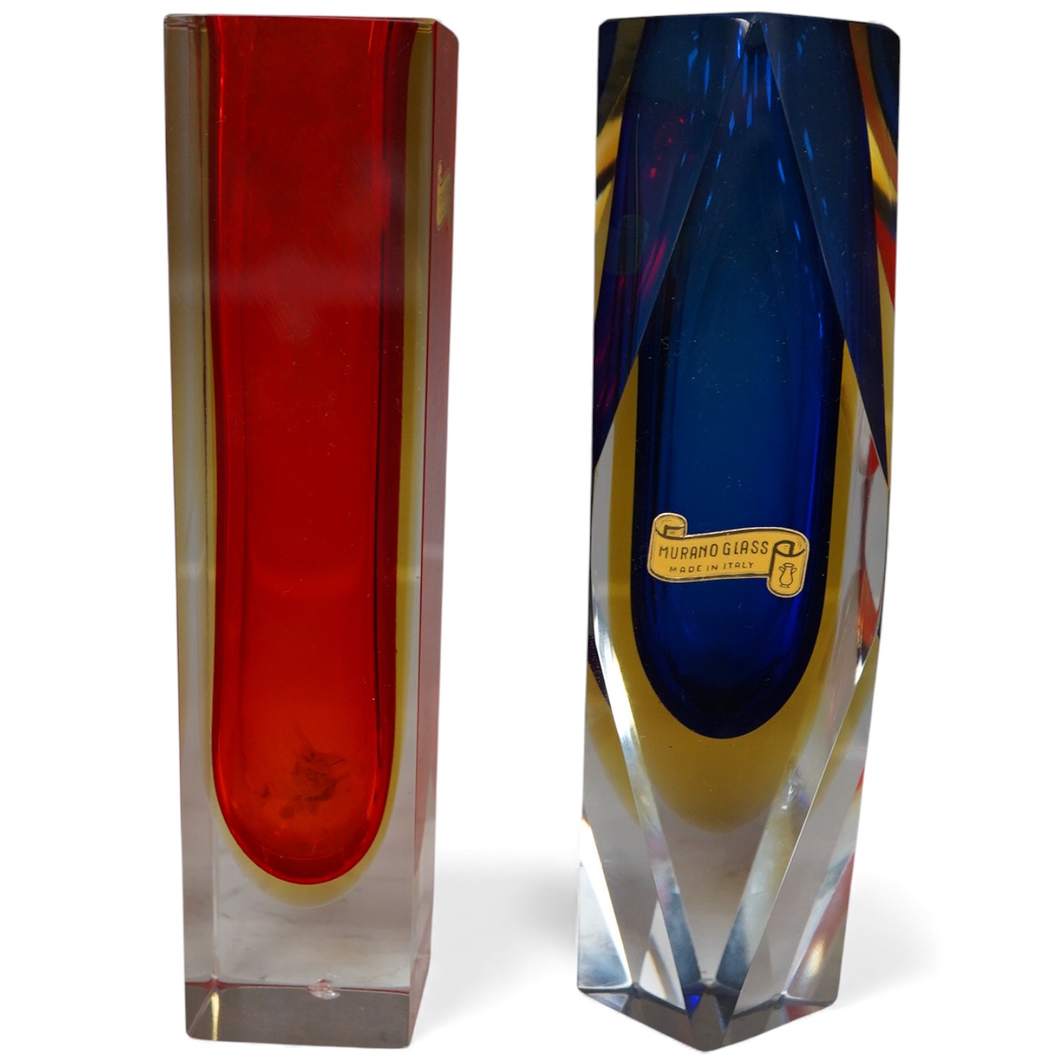 Two Murano Sommerso tri-colour vases, one with signature and date 29.8.88 to the base, each with labels, 20cm high