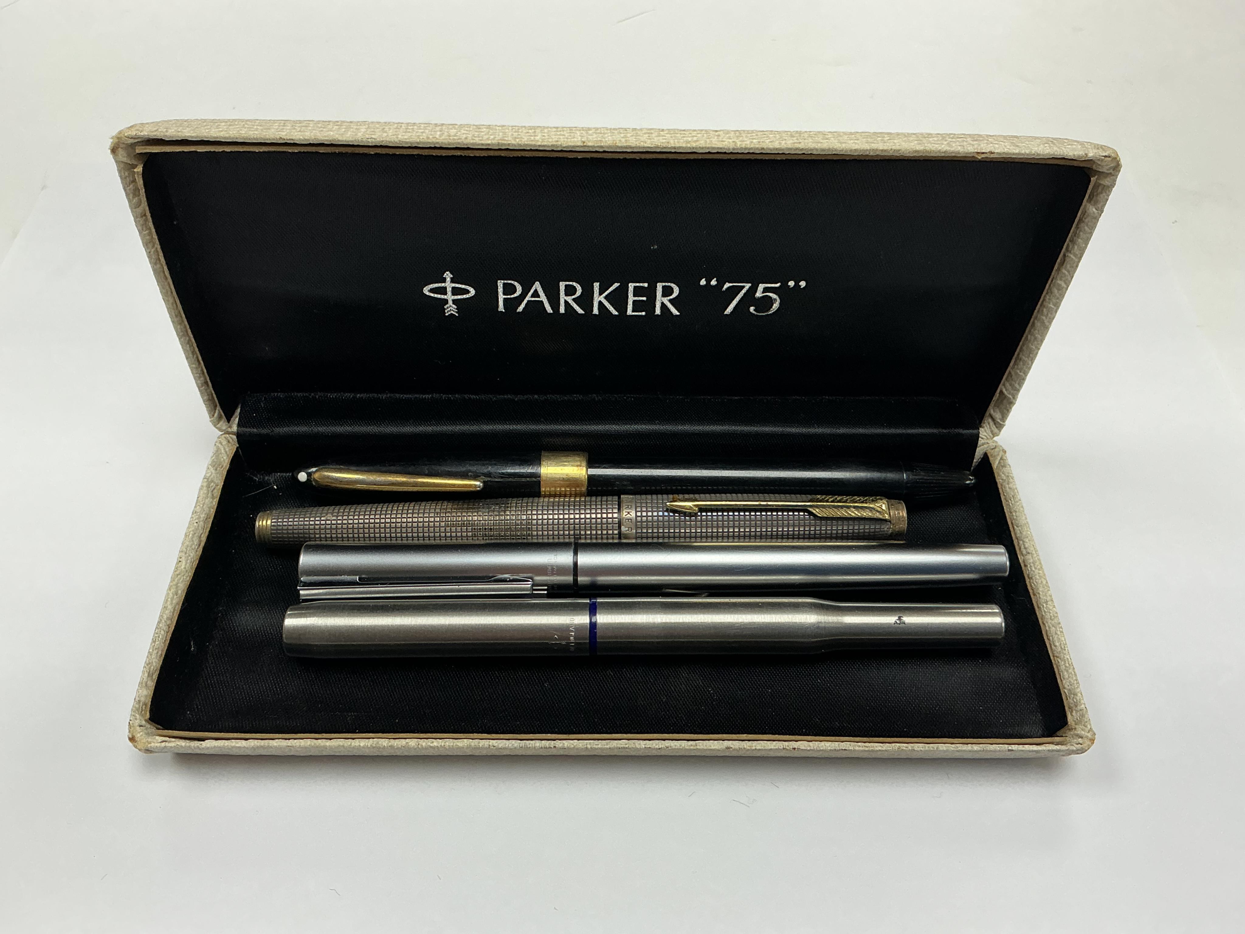 Two Parker fountain pens including sterling silver, a Sheaffer's fountain pen with 14k nib and a Waterman fountain pen.