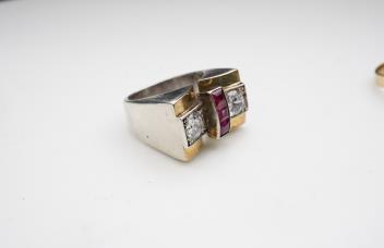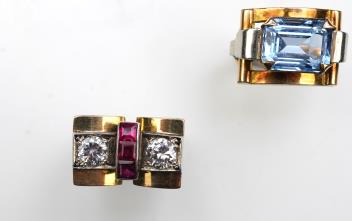 Two Retro synthetic stone and paste cocktail rings, 1940s, comprising: a ring set with two circular-cut pastes flanking a line of calibré-cut synthetic rubies, to a tank-style mount in gilt silver, size L, French assay marks; and a ring set with a step-cut synthetic blue spinel in a bicoloured mount of geometric design, in gilt metal, size L, stamped FIX