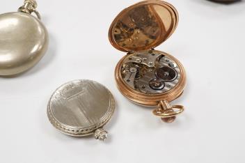 Two Waltham base metal keyless pocket watches including a dress pocket watch with Arabic dial and subsidiary seconds, together with a gold plated open faced keyless pocket watch and a base and gun metal 'Regulateur' open faced keyless pocket watch, case diameter 63mm.