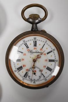 Lot 1909 , Two Waltham base metal keyless pocket watches including a dress pocket watch with Arabic dial and subsidiary seconds, together with a gold plated open faced keyless pocket watch and a base and gun metal 'Regulateur' open