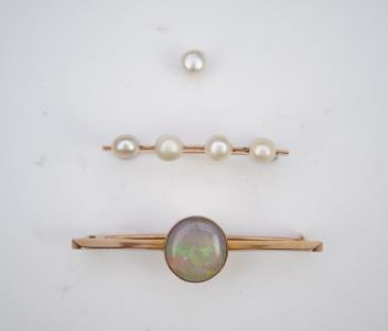 Two bar brooches, early 20th century, comprising: a brooch set with a cabochon opal measuring approximately 13.8 x 12.1 x 6.0mm, mounted in gold, length 5.2cm; and a bar brooch set with four pearls measuring approximately 5.0-5.5mm diameter, mounted in gold, length 3.9cm, combined gross weight approximately 8 grams, together with an unmounted pearl, pearls untested