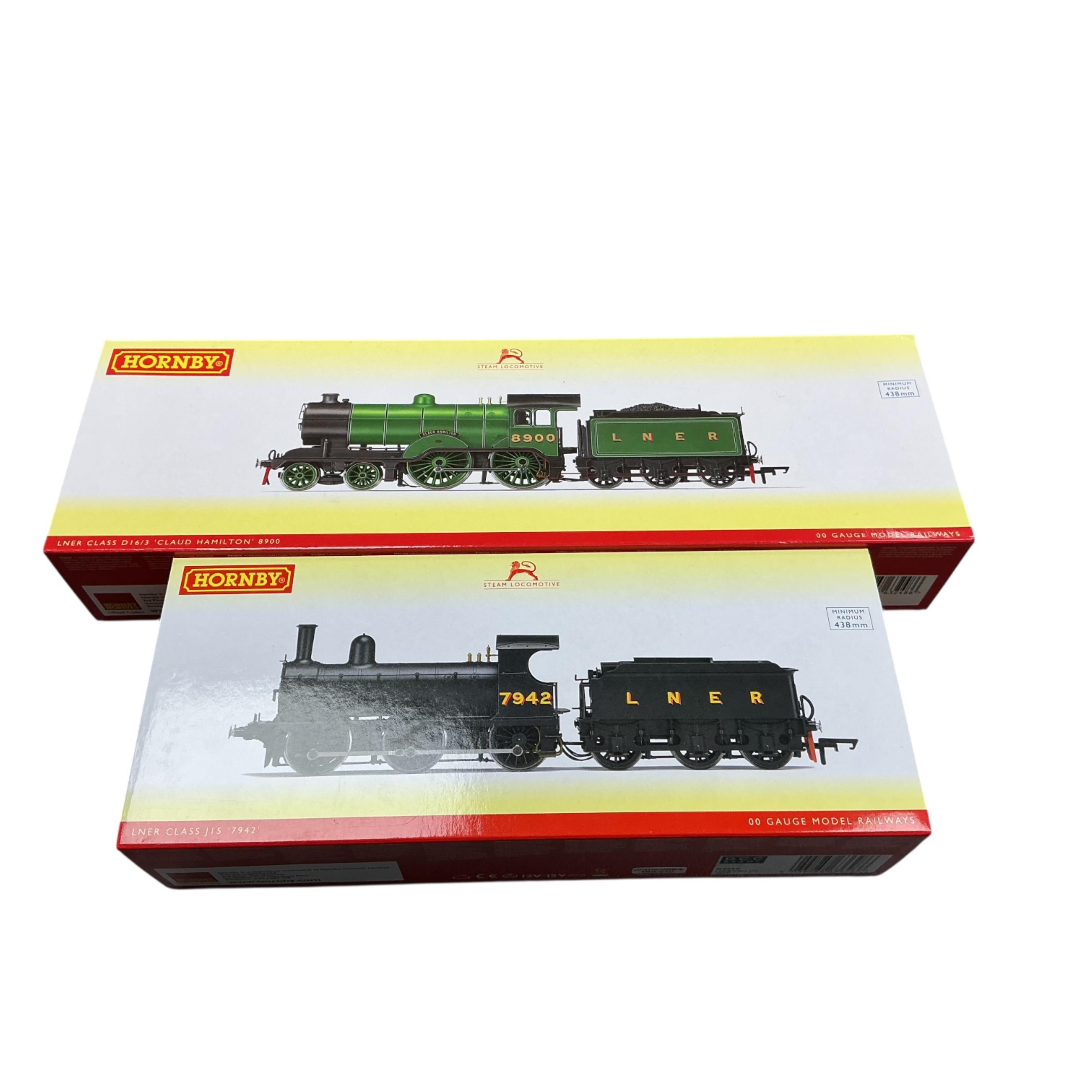 Two boxed Hornby Hobbies 00 gauge railway LNER tender locomotives; a class D16/3 Claud Hamilton 8900 (R3433), and a class J15, 7942 (R3529)