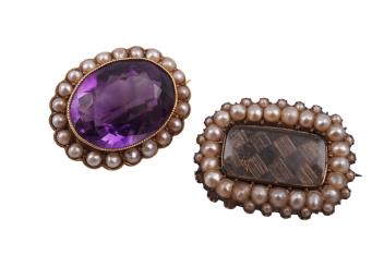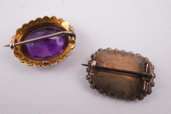 Two brooches, 19th century and early 20th century, comprising: an Edwardian amethyst and seed pearl brooch, mounted in gold, length 2.2cm, stamped 15CT, gross weight approximately 4.6 grams; and a Georgian seed pearl and hairwork mourning brooch, early 19th century, mounted in gold, length 2.3cm, seed pearls untested, gross weight approximately 4 grams, several seed pearls deficient