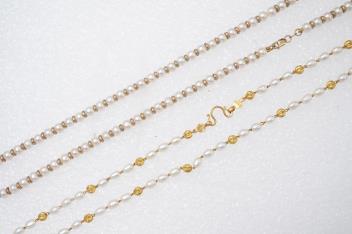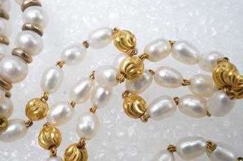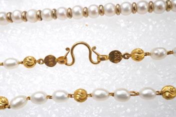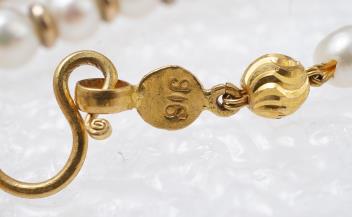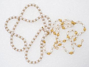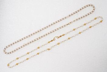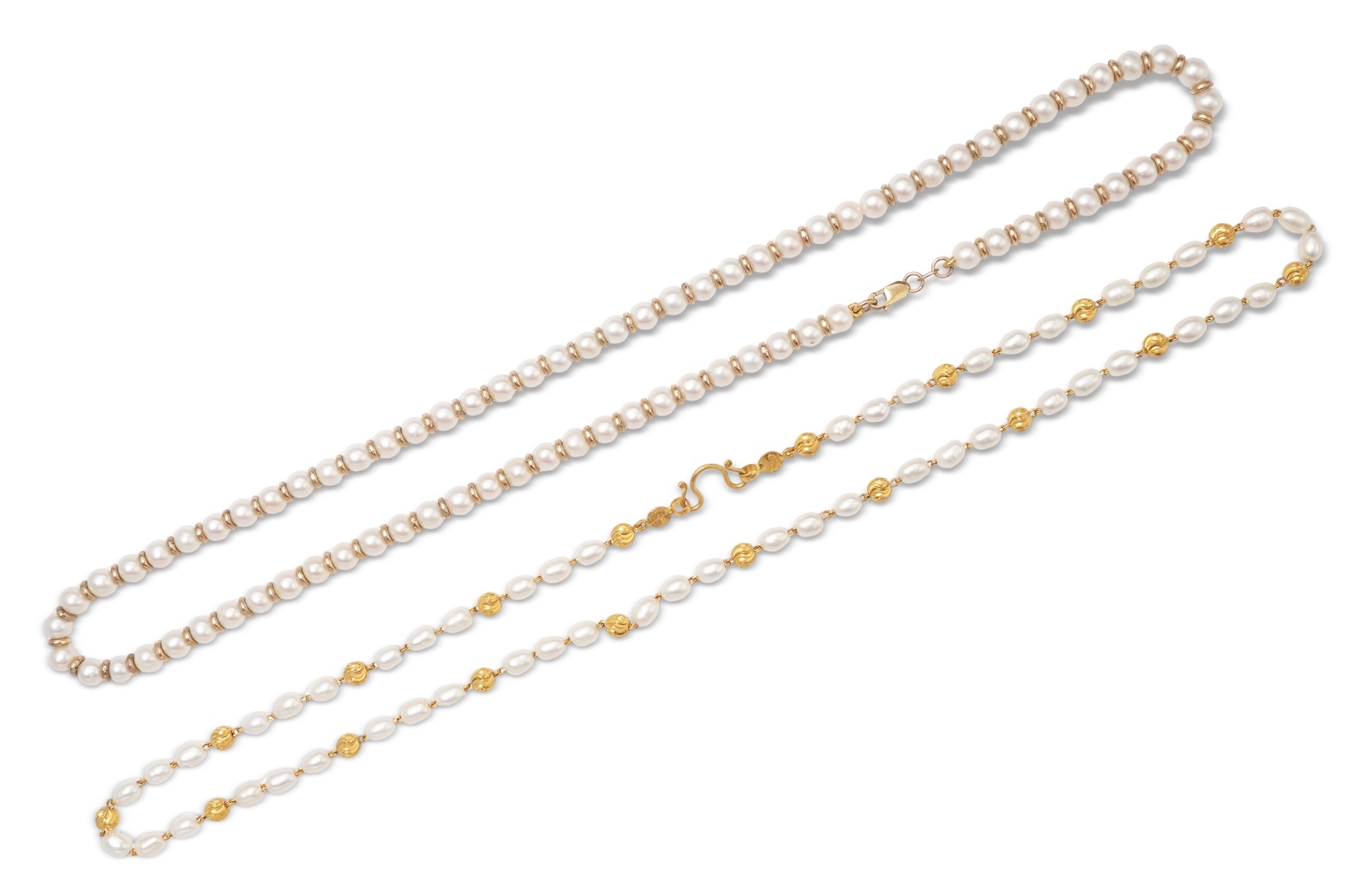 Two cultured pearl and gold necklaces, each composed of cultured pearls strung with gold spacers, one with British hallmarks for 9ct gold, length 46.5cm, gross weight approximately 23.5 grams; the other with oval cultured pearls, the hook clasp stamped 916, length 49cm, gross weight approximately 14 grams