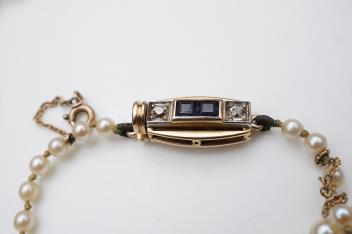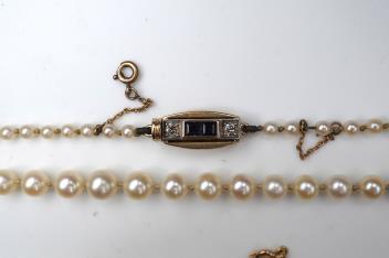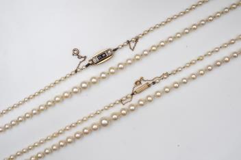 Two cultured pearl necklaces, mid 20th century, comprising: a necklace composed of graduated cultured pearls measuring approximately 3-6.5mm, to a gold clasp set with calibré-cut sapphires and two circular-cut diamonds totalling approximately 0.15 carats, length 50cm; and another composed of graduated cultured pearls measuring approximately 3.4-7.8mm, to a cylindrical gold clasp of fluted design, length 54cm, clasp with French assay mark for 18ct gold
