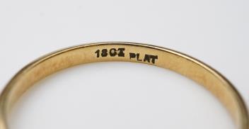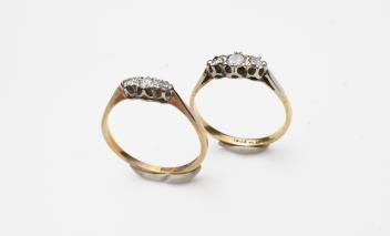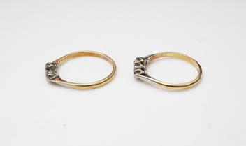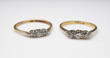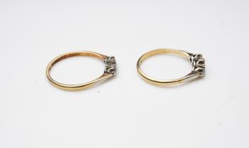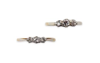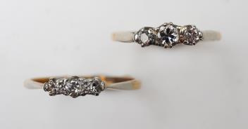Two diamond rings, each set with three circular-cut diamonds totalling approximately 0.13 carats and 0.30 carats respectively, mounted in gold and platinum, sizes N and P1/2 respectively, each stamped 18CT PLAT, combined gross weight 4 grams