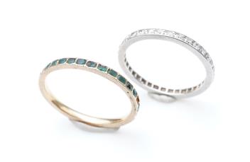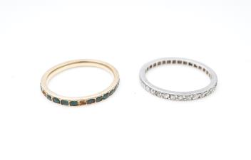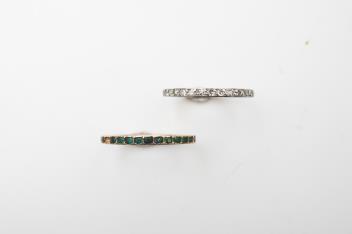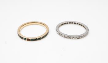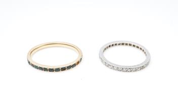 Two eternity rings, early 20th century, comprising: an Art Deco ring designed as a continuous band of single-cut diamonds totalling approximately 0.60 carats, mounted in platinum, size N1/2, faintly numbered; and another eternity ring set with green pastes, mounted in closed gold settings, size M, 3 stones deficient