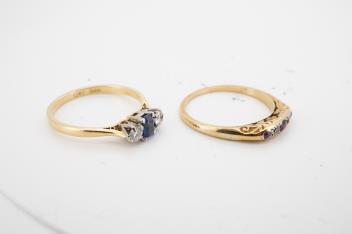 Lot 1944 , Two gem-set rings, comprising: a sapphire and diamond three-stone ring, the diamonds totalling approximately 0.20 carats, mounted in gold and platinum, size P, stamped 18CT PLAT; and a ruby and diamond five-stone ring, s