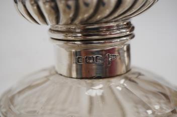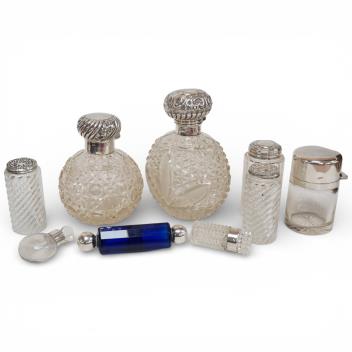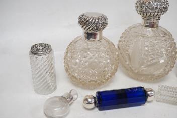 Lot 1849 , Two late Victorian silver mounted cut glass scent bottles, with stoppers, including London, 1897, together with three other scent bottles including two silver mounted, a silver mounted glass salts bottle and three silver