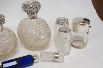 Two late Victorian silver mounted cut glass scent bottles, with stoppers, including London, 1897, together with three other scent bottles including two silver mounted, a silver mounted glass salts bottle and three silver mounted toilet jars.
