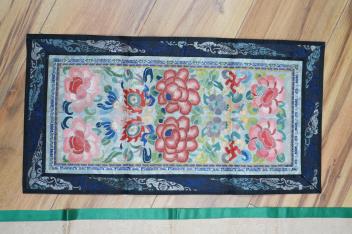 Lot 269 , Two pairs of Chinese late 19th / early 20th century polychrome silk embroidered sleeve bands, now converted into two decorative table runners, one embroidered with large flowers using Peking knot, the other heavily embro