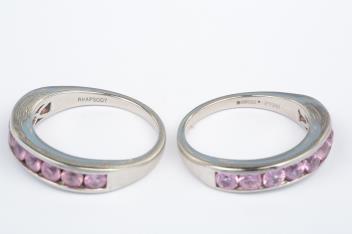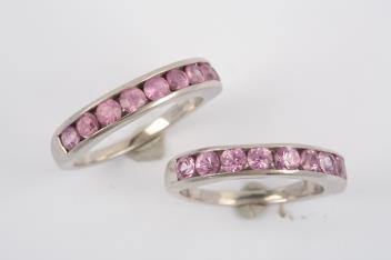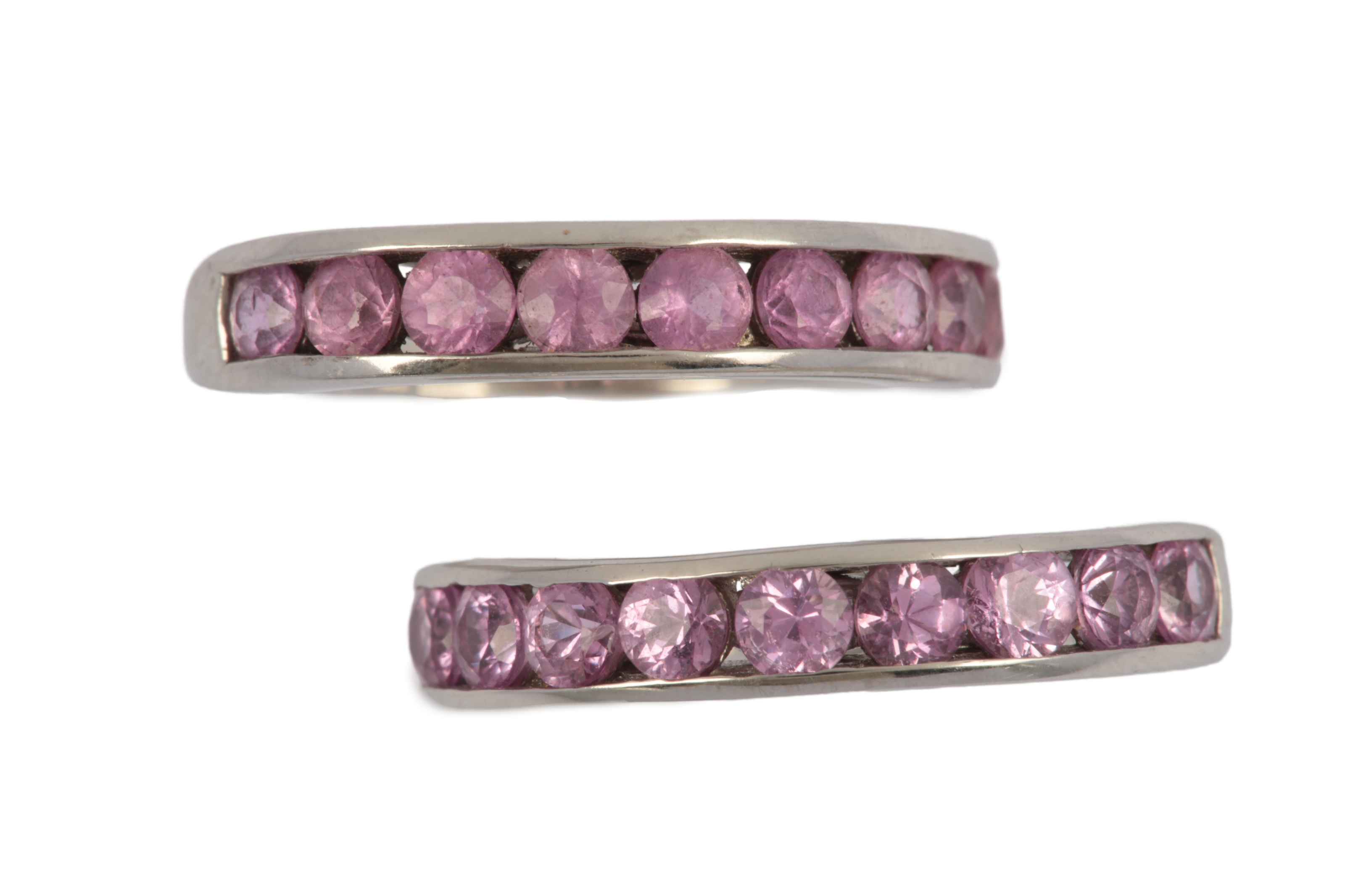 Two pink tourmaline half eternity rings, each channel-set with a line of circular-cut pink tourmalines, mounted in platinum, sizes L1/2 and M1/2, British hallmarks, combined gross weight approximately 10.5 grams