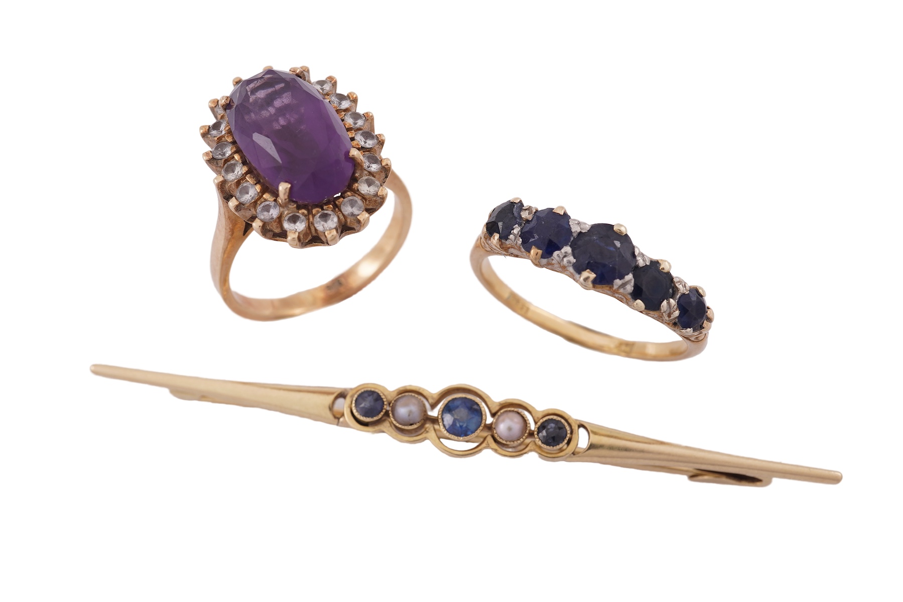 Two sapphire jewels, early 20th century, and a later amethyst and simulant diamond ring, comprising: a sapphire and split pearl bar brooch mounted in gold, length 6.5cm, stamped 15CT, gross weight approximately 4 grams, pearls untested; a five-stone sapphire ring in gold, size Q, stamped 18CT, gross weight approximately 3 grams; and a later amethyst and simulant diamond cluster ring in gold, size K1/2, stamped 585, gross weight approximately 6 grams