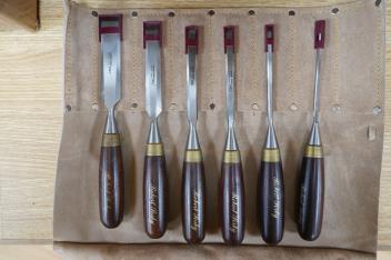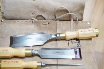 Lot 2264 , Two sets of Robert Sorby woodworking chisels, both in Kuny’s of Canada leather tool rolls; a nine piece set with octagonal handles, together with a six piece set with rosewood handles