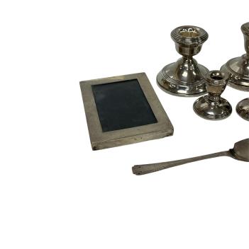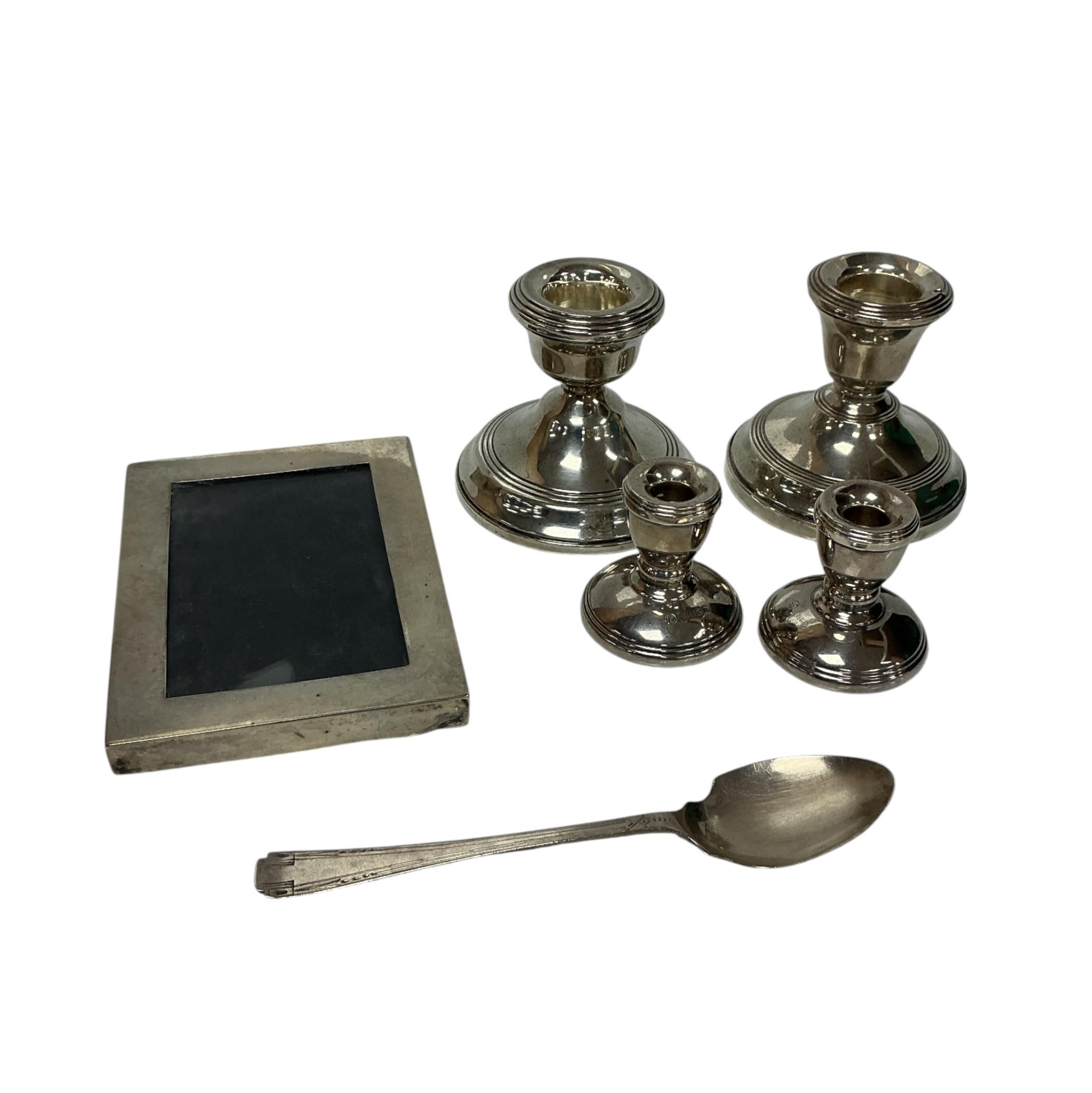 Two silver mounted dwarf candlesticks, S.M. Levi Ltd, Birmingham, 1935 and W.I. Broadway & Co, Birmingham, 1970, approx. 62mm, together with a smaller pair of silver mounted dwarf candlesticks, L.J. Millington, Birmingham, 1993, a George V silver mounted rectangular photograph frame, London, 1917 and a mid 20th century silver spoon by Frank Cobb Ltd.