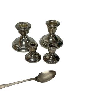 Lot 1855 , Two silver mounted dwarf candlesticks, S.M. Levi Ltd, Birmingham, 1935 and W.I. Broadway & Co, Birmingham, 1970, approx. 62mm, together with a smaller pair of silver mounted dwarf candlesticks, L.J. Millington, Birmingha