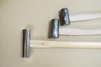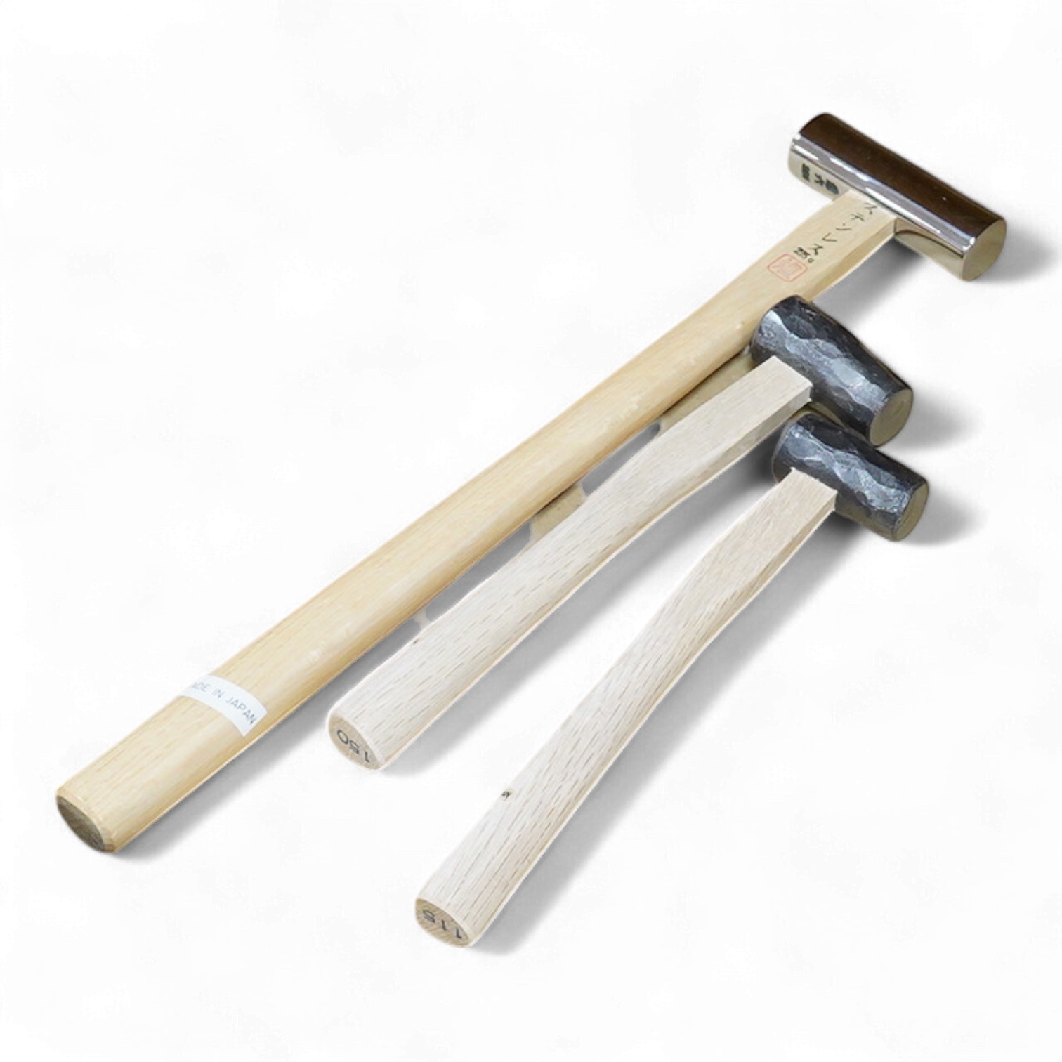 Lot 2309 , Two wood cased Japanese woodworking chisel sets, a timber framing set of five chisels and a 10 piece set of smaller chisels, both in fitted boxes, together with three small Japanese hammers