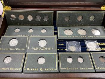 USA coins, comprising three Eisenhower dollars, liberty walking half dollar, Kennedy half dollar, Barber Quarter, standing liberty Quarter, Jefferson nickels, Buffalo nickels, two Barber dimes etc. in display case.