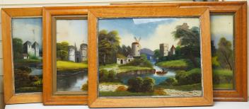 Victorian School, four reverse glass painted panels, Riverscapes, largest 39 x 60cm
