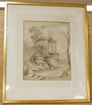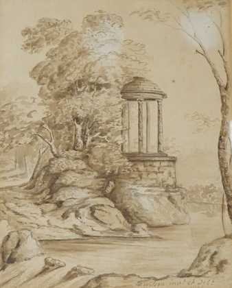 Lot 713 , W. Wilson, riverscape with classical ruin, signed and dated 1825, early 19th century sepia watercolour, 21.5 x 17cm
