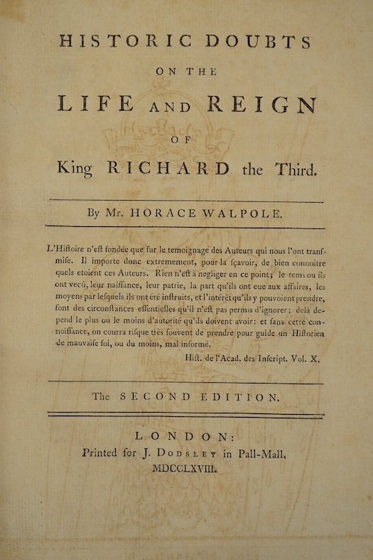Lot 1013 , Walpole, Horace - Historic Doubts on the Life and Reign of King Richard the Third. 2nd edition