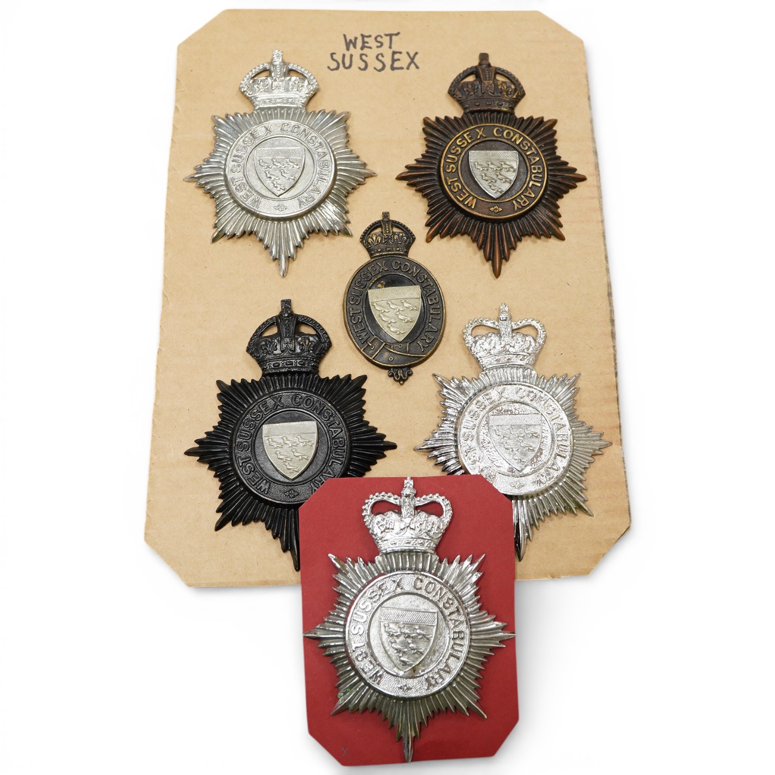 West Sussex Constabulary helmet plates: four Kings crown, two Queens crown, (6).