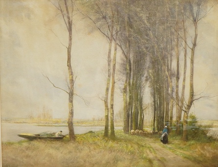 William Tatton Winter RBA (1855-1928), Riverscape with flock of sheep, signed, watercolour, 56 x 73cm
