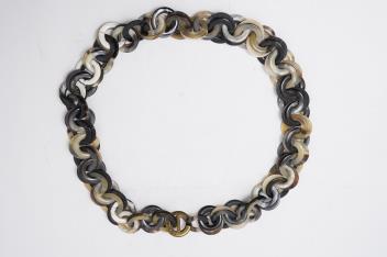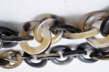 Yves St Laurent, a horn necklace, composed of horn links, to a circular bronze clasp, length 88cm, signed Yves Saint Laurent