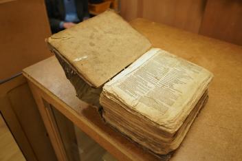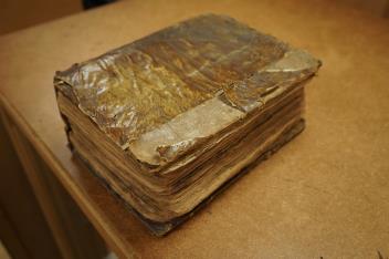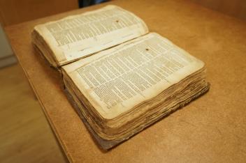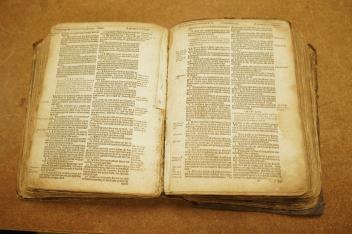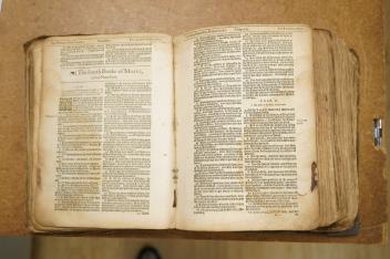 Bds. worn with some pieces missing, inner joints cracked, gen. title damage - lacks most of lh. border top 4 panels (but clear of title printing), sl. marginal loss torn lh. border next leaf; lacks text leaf Cl (Genesis ch.42 all and chs. 41, 43 pt.of), E1 tear with sl. loss, L4 minimal loss, NI sl. loss, Z1 minimal loss, some paper gutter repairs (clear of notes), usual (non obscuring) stains etc., some leaf creasing/edge fraying; Genealogies (2, 34pp.) lacks pp. 15/16 and the map with 2/3 leaves loose; lacks the 2 Concordances following NT. nb. signature Hhh not used; as often with these Bibles old prayer book leaves precede and psalms etc. follow the required text. Additional photos added. First PP - old prayer book (extra material), Genealogies, title page End PP Psalms (extra material) revelation/Colophon Additional photos of the front, back covers and spine have been added. In the book of Ruth, chapter 3:15 it is printed HE went into the citie.